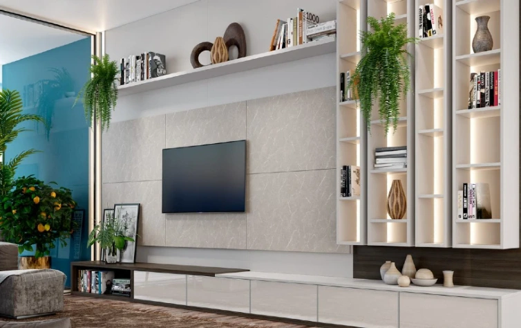 Mobília com ângulos retos e utilização de materiais como mármore, cromado, madeira em tons claros são comuns do estilo.