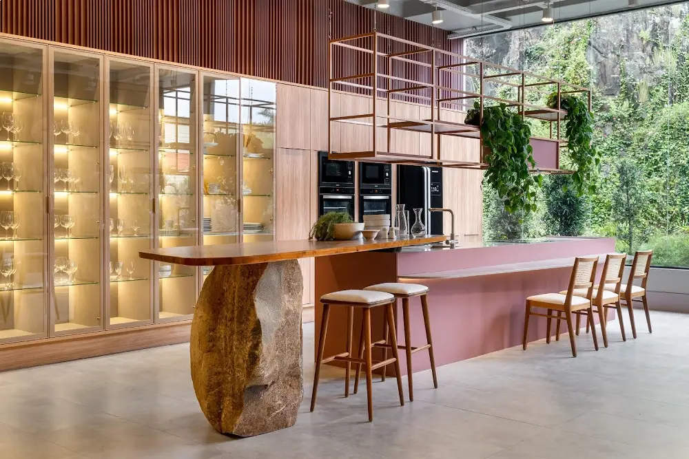 O resultado mágico da química entre a madeira e o concreto. O concreto, um material tradicionalmente associado à robustez, é reimaginado com móveis sofisticados e acabamentos premium. Superfícies de concreto polido ou com detalhes exclusivos transformam mesas e balcões em peças centrais de uma narrativa moderna e elegante.