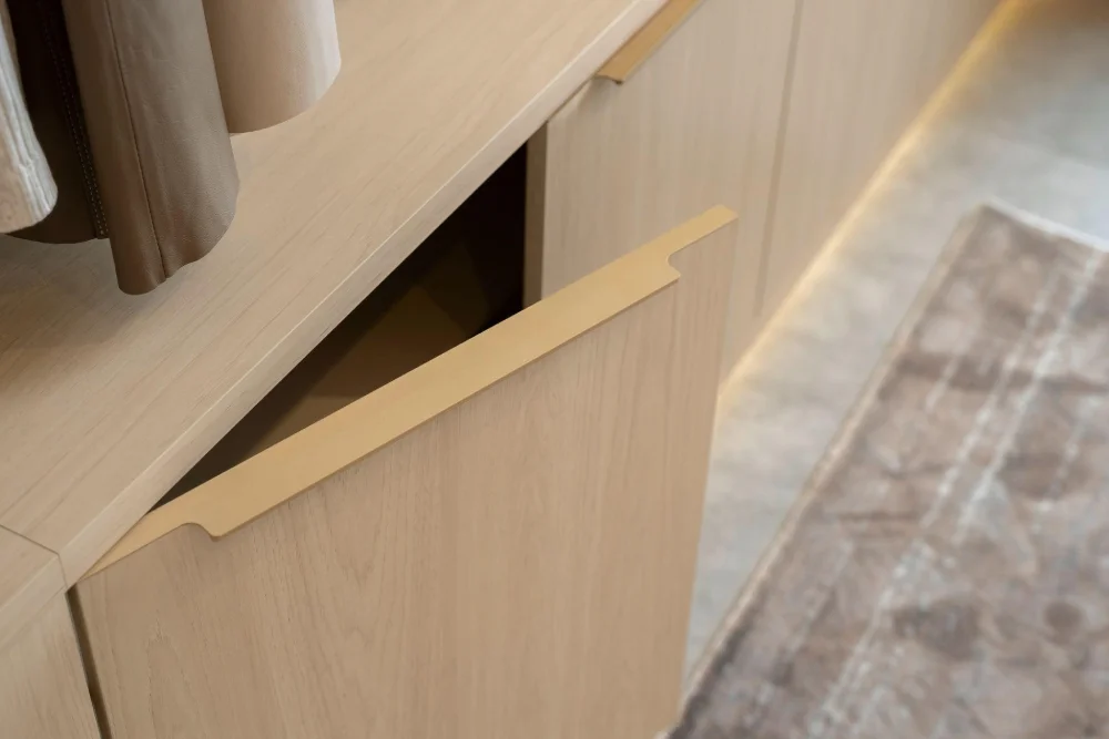 Para manter o visual clean e moderno em uma cozinha pequena, opte por puxadores discretos ou sem puxadores aparentes nos armários. Os puxadores embutidos ou com um design minimalista são ótimas opções, pois não interferem na estética dos móveis. Puxadores discretos também evitam que você esbarre neles enquanto circula pela cozinha, o que é especialmente importante em espaços reduzidos.