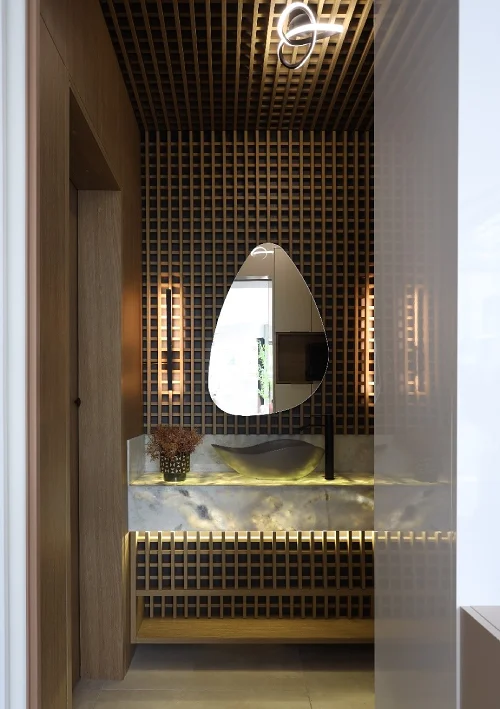A iluminação certa valoriza os móveis do banheiro.