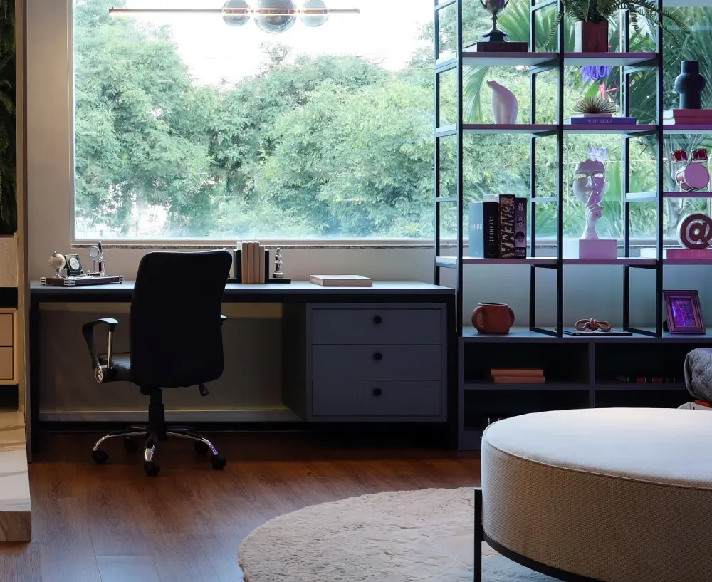 Organização visual: mantenha seu espaço de trabalho organizado com organizadores de mesa, bandejas e cestos de armazenamento integrados aos móveis planejados sem comprometer a modernidade. Além disso, oculte cabos e fios de eletrônicos nos móveis ou incorpore-os como parte da decoração, assegurando uma aparência limpa e organizada.