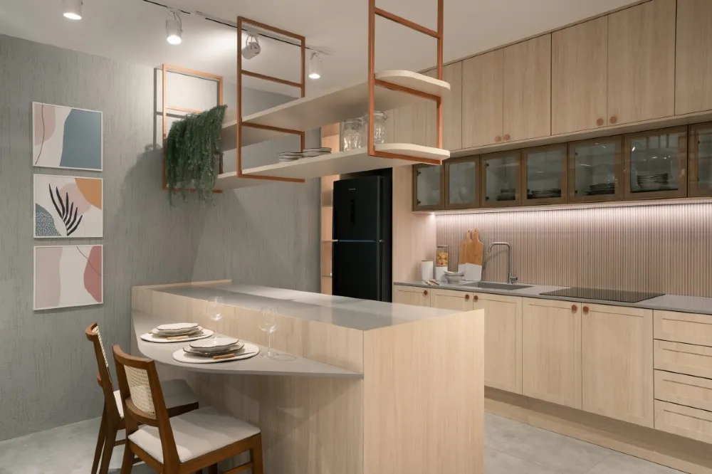 - Convivência facilitada: a integração dos ambientes permite que cozinhar e socializar aconteçam simultaneamente, tornando o preparo das refeições mais participativo e conectado com familiares ou convidados.